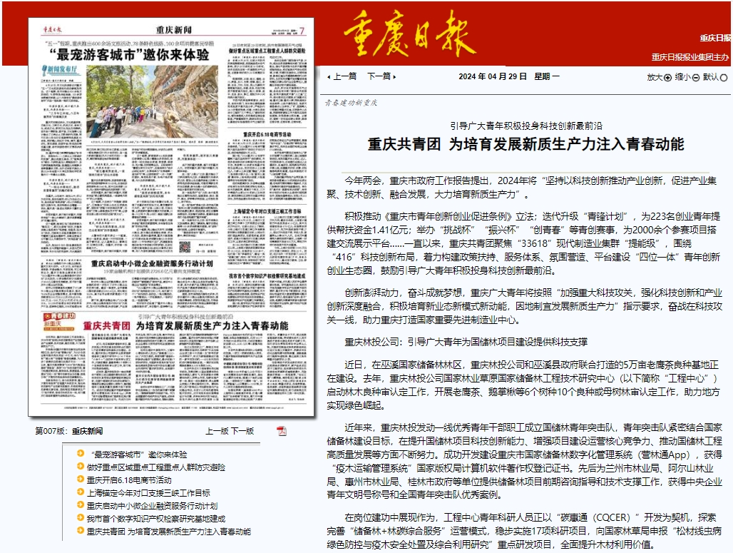 重慶日報聚焦林投青年為國儲林項目建設提供科技支撐,作題為“重慶共青團 為培育發展新質生產力注入青春動能”的報道,刊登于重慶日報2024年4月29日重慶新聞第7版。