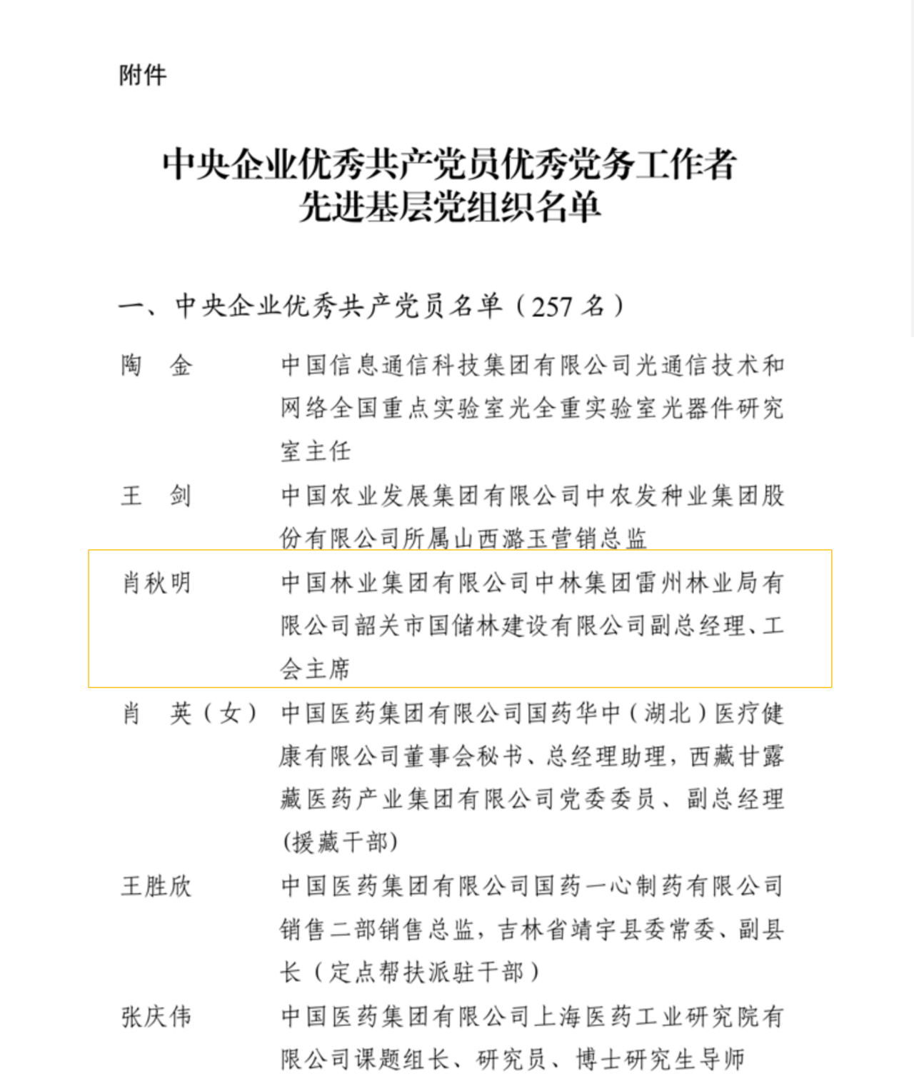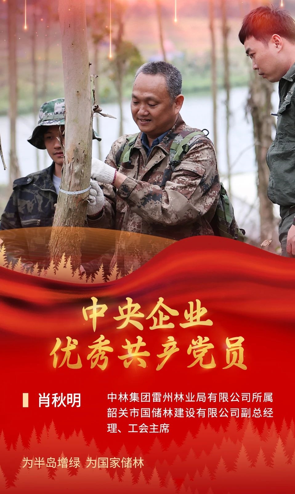 中林集團雷州林業局有限公司韶關市國儲林建設有限公司副總經理、工會主席肖秋明榮獲“中央企業優秀共產黨員”稱號。