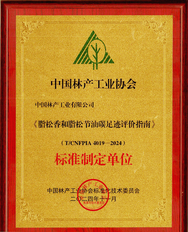 2024年度,中林集團(tuán)所屬中國(guó)林產(chǎn)工業(yè)有限公司積極落實(shí)集團(tuán)戰(zhàn)略部署,始終堅(jiān)持聚焦主責(zé)主業(yè),持續(xù)改革創(chuàng)新,助力中林品牌向智能化、綠色化轉(zhuǎn)型升級(jí)。作為中國(guó)林產(chǎn)工業(yè)協(xié)會(huì)松香分會(huì)理事長(zhǎng)單位,林產(chǎn)公司牽頭組織全國(guó)松香行業(yè)重點(diǎn)企業(yè)和科研院所制訂的《松脂碳儲(chǔ)量計(jì)算方法》和《脂松香和脂松節(jié)油碳足跡評(píng)價(jià)指南》兩項(xiàng)團(tuán)體標(biāo)準(zhǔn)于2024年11月正式發(fā)布。