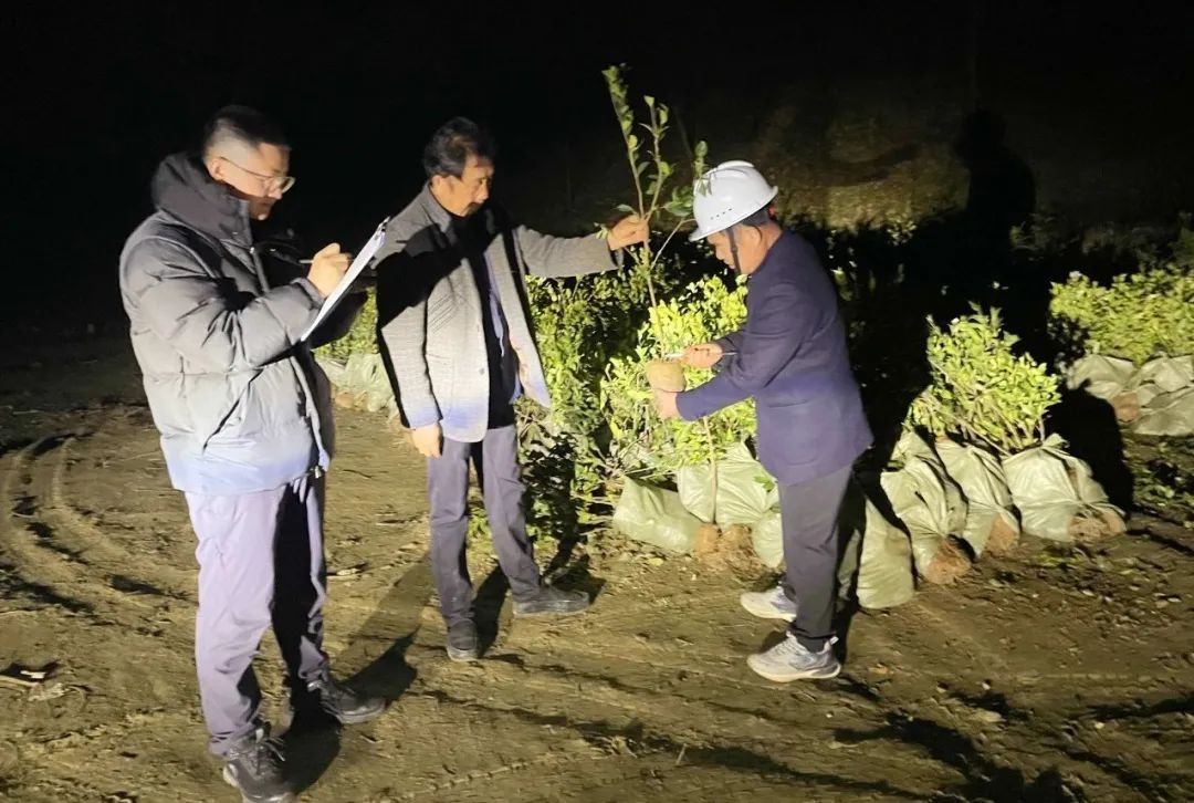 栽植高峰期,項目團隊顧不上喝口水、歇口氣,逐地塊排查苗木栽植的各個環節是否到位,為數十萬株新苗的成活構筑了堅實的質量防線。