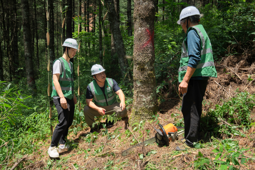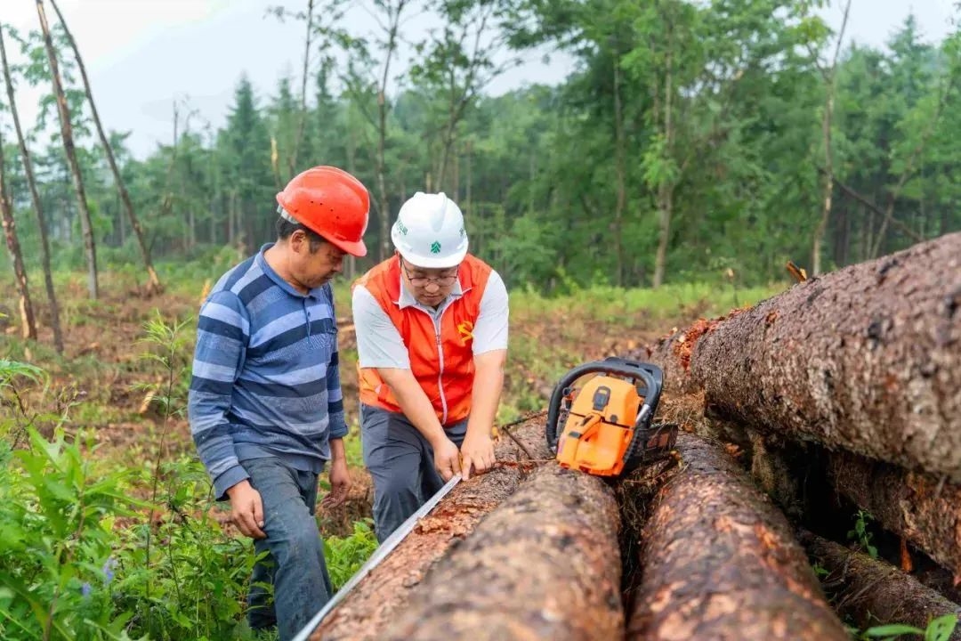 楊鑫(左二)現(xiàn)場指導(dǎo)采伐施工