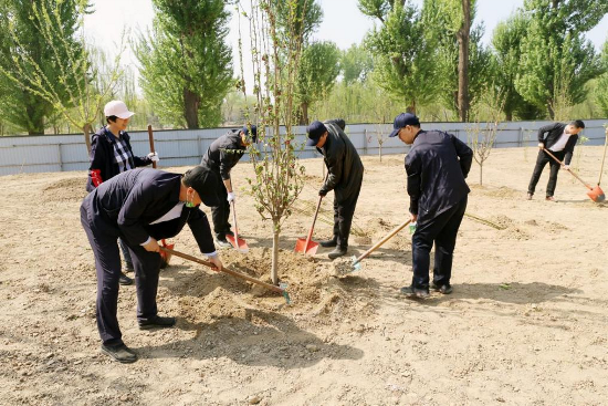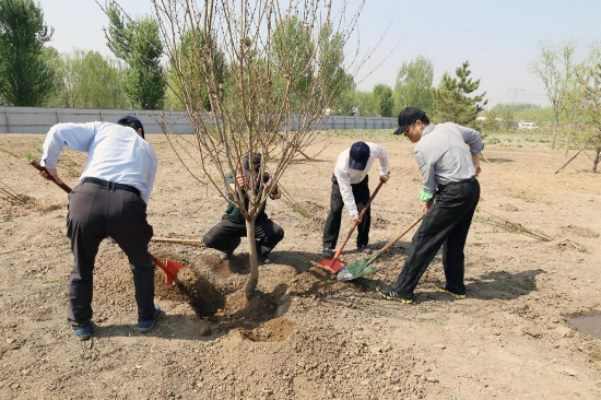 植樹現場,參加植樹的同志揮鍬培土、扶苗入坑、填土踩實、提桶澆水,合力栽植了國槐、楸樹、丁香等240余株。