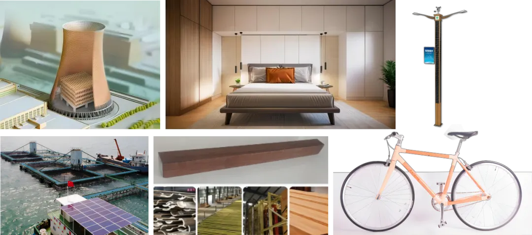 2024年我國政府工作報告中提出,要加強生態文明建設,推進綠色低碳發展,這說明綠色低碳發展是未來相當長一段時期內的總基調。中林集團以科研賦能,用實干增勢,在低碳竹產業發展方面,積極開拓我國竹產品生態價值轉換路徑,目前已推出如竹格淋水填料、竹生態板、竹基智慧燈桿、竹基海洋牧場、竹基鐵軌枕木、竹自行車、竹風力發電機葉片等“以竹代塑、代鋼、代砼”系列產品。