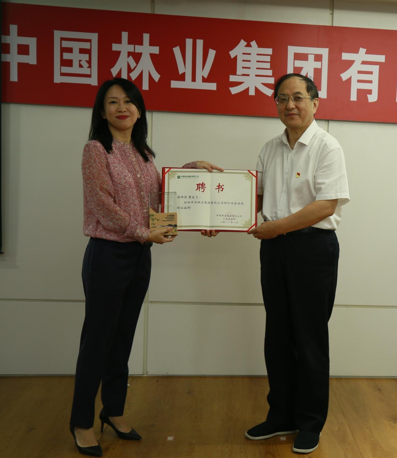 通過授課,集團公司廣大職工對“碳達峰、碳中和”相關背景、政策有了進一步了解,同時也為集團公司下一步推進林業碳匯相關工作提供了指導和借鑒。集團公司董事、黨委副書記劉連軍為黃達飛頒發了“中林集團專家講師”獎杯和聘書。