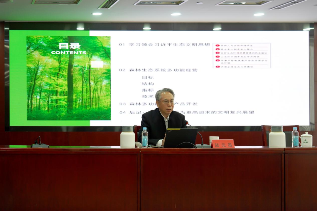 陸元昌從習近平生態文明思想的基本內涵切入,圍繞森林生態系統多功能協力經營、系統目標、系統結構、指標體系、技術要點等方面,生動詮釋了森林生態系統多功能協力經營理論的科學內涵,并就森林多功能價值產品體系建設提出了科學性的建議,為廣大干部提供了系統的森林經營管理理論指導,深刻闡明了現代林業產業的發展方向。授課后,陸元昌還圍繞森林康養、林業法規、鄉村振興進行了答疑交流。