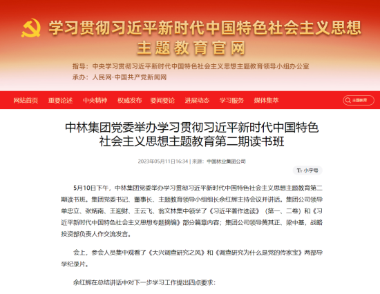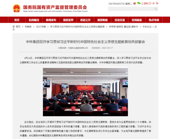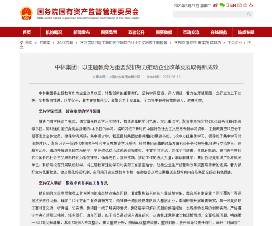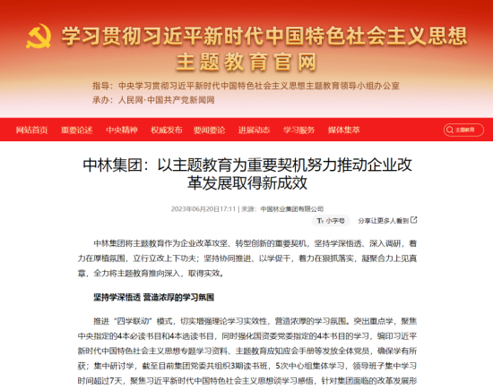 近日,中央主題教育官網(wǎng)、國資委網(wǎng)站、國資委主題教育簡報(bào)相繼報(bào)道聚焦集團(tuán)主題教育開展情況、實(shí)際成效和好經(jīng)驗(yàn)、好做法,對(duì)中林集團(tuán)主題教育開展情況給予充分肯定。